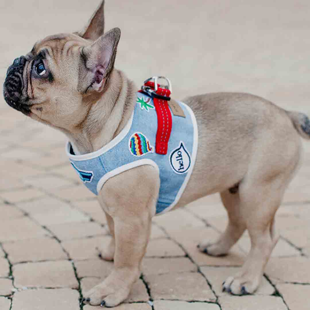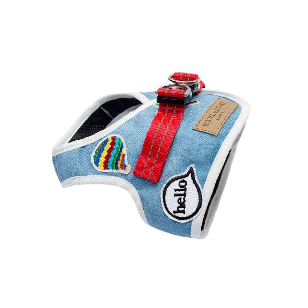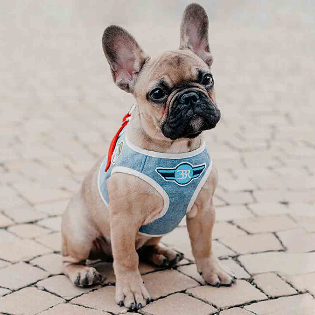 Bowl and Bone Republic® DENIM vest modna oprsnica za pse iz jeansa svetlo modre barve.