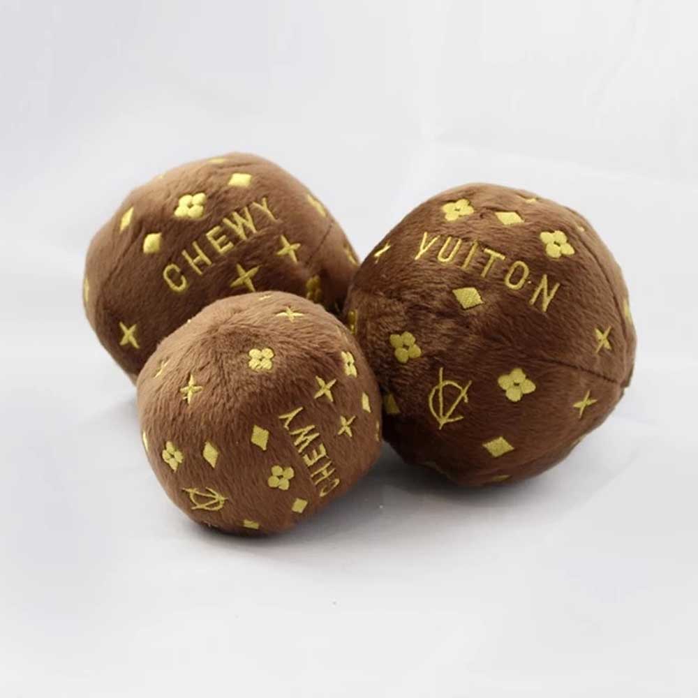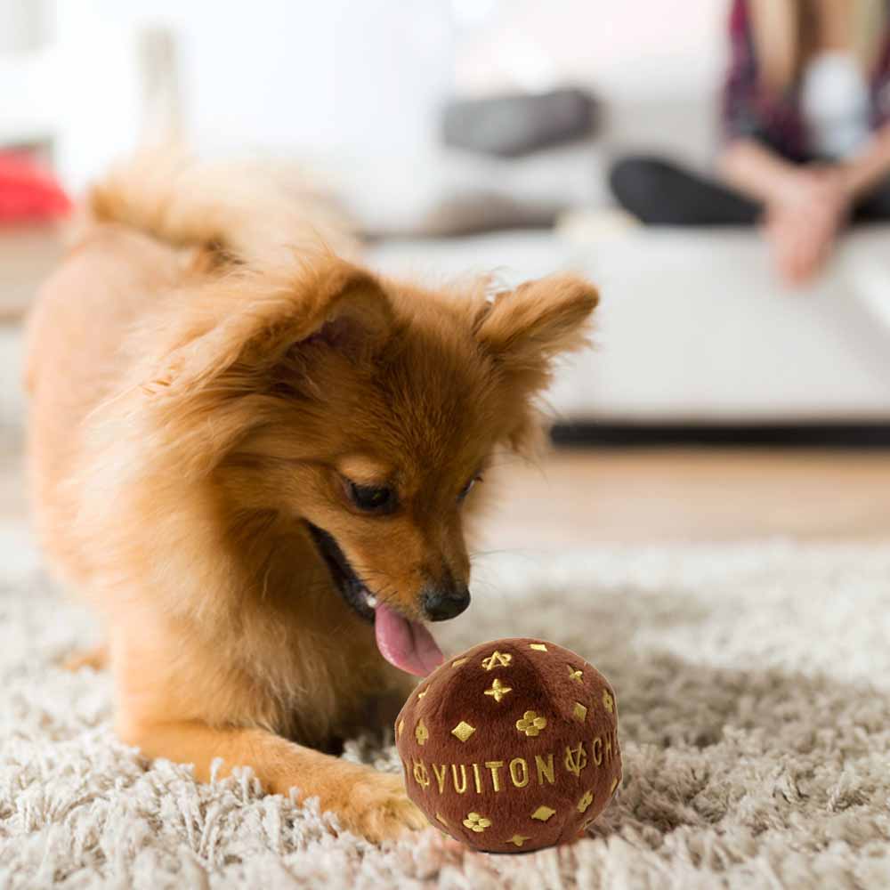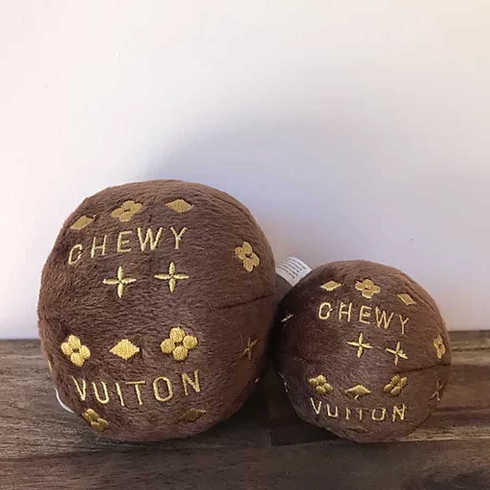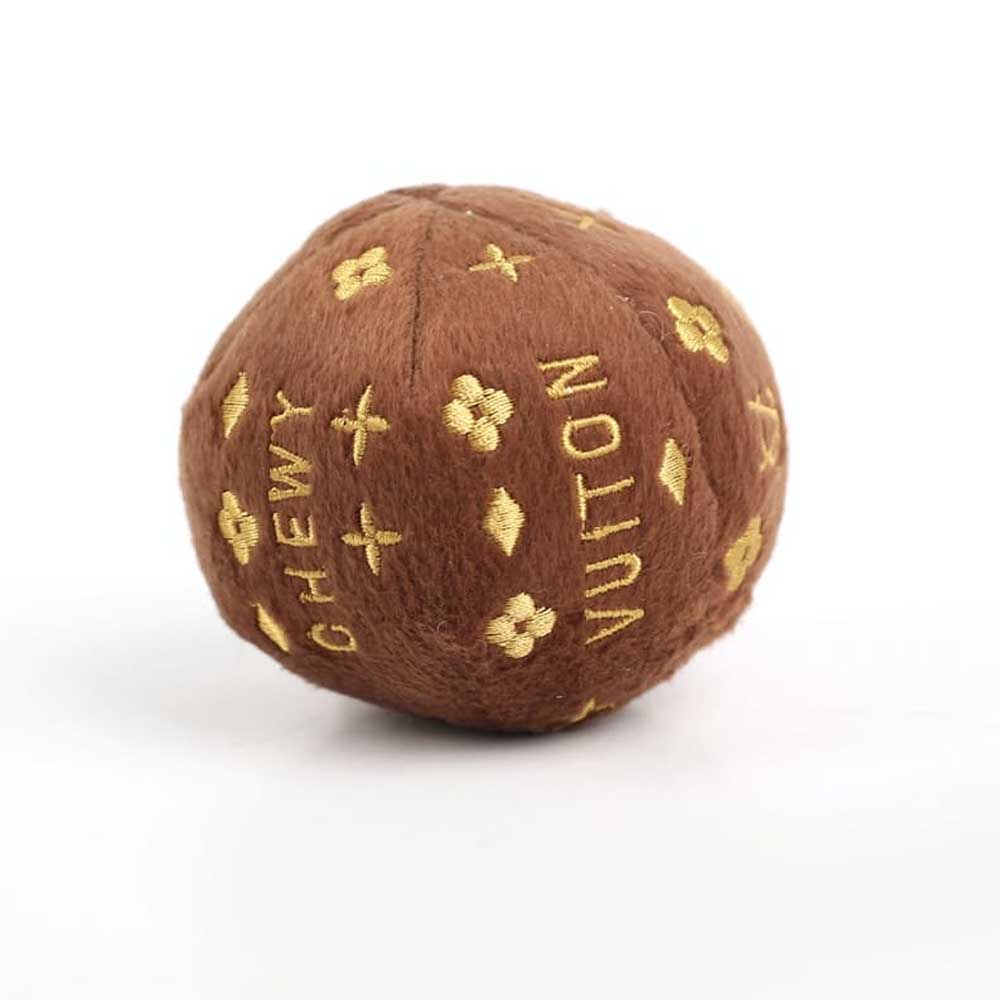 Dog Diggin Designs® Igračke kot parodija na priznane blagovne znamke – CHEWY VUITON BALL igračka za psa v obliki žogice – rjave barve