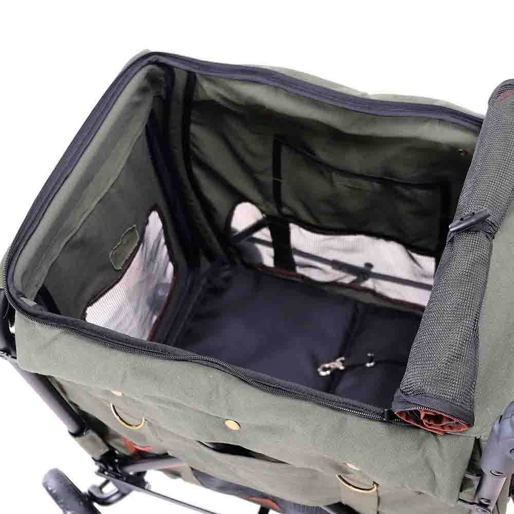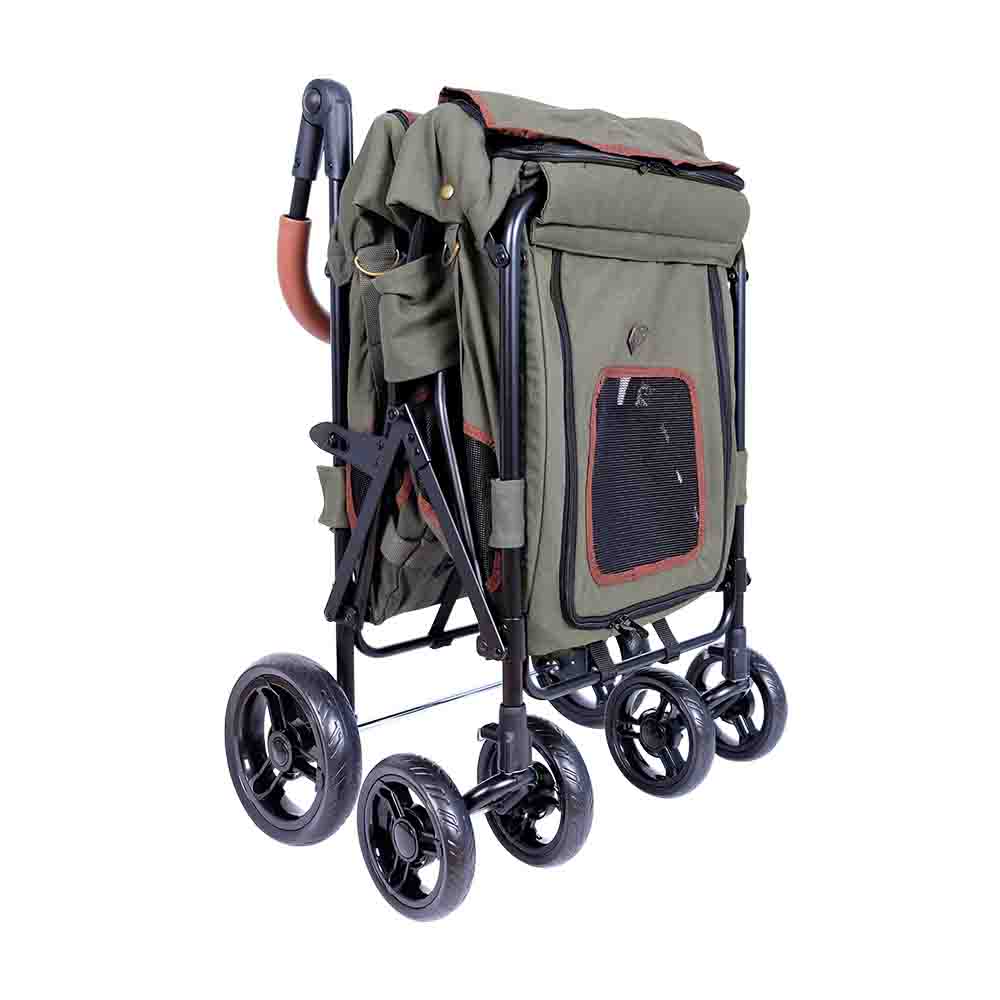 Ta voziček je izdelan iz trpežne trpežne tkanine in je udoben in kompakten. Narejen je tako, da lahko ljubljenček vanj vstopi iz dveh strani. zato lahko ljubljenčka vanj naložite tako od spredaj kot od zadaj. Idealen je za starejše, poškodovane ljubljenčke, katerih gibalne sposobnosti so kratkotrajnejše ali omejene.
