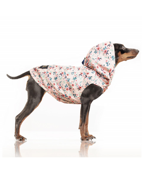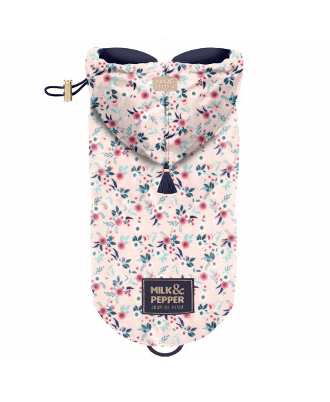 Nepremočljiva jakna brez rokavov v svetlo roza barvi s cvetličnim večbarvnim potiskom, opremljena s kapuco, odstranljivo s pritiskači, ter dodatnimi detajli v mornarsko modri barvi, z zlatimi pritiskači in dodatki, kot so elastični trak za prehod repa in odprtina za prehod povodca.