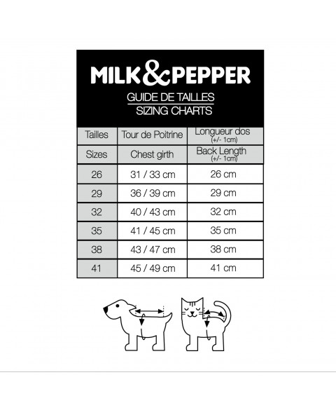 Nasvet: Pravilno velikost izberete tako, da izmerite obseg prsnega koša kužka. Ta se mora ujemati z velikostjo, ki je navedena v preglednici.