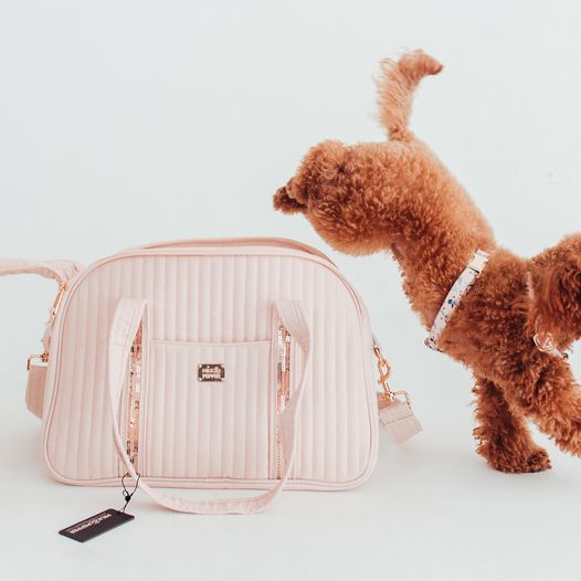 Naramnica je iz rožnate gabardine in okrašena z zlatimi bleščicami, prav tako s pritrjenim zlatim kovinskim karabinom.