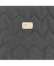 Majhna kovinska ploščica “Milk&Pepper” v barvi titana na vrhu hrbta.