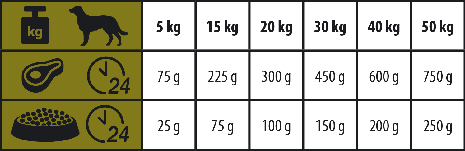 Dodajte 1/3 teže dnevnega obroka mesa vašega psa. Na primer, na 300 g mesa dodajte 100 g Barf balancerja. Za odraslega psa priporočamo količino mesa, ki ustreza 1-1,5% telesne teže živali na dan. Za večje pse priporočamo, da dnevni obrok razdelite na dva obroka (zjutraj in zvečer). Prilagodite dnevni obrok hrane stanju vašega psa in njegovi stopnji aktivnosti. Zagotovite neomejen dostop do pitne vode.
