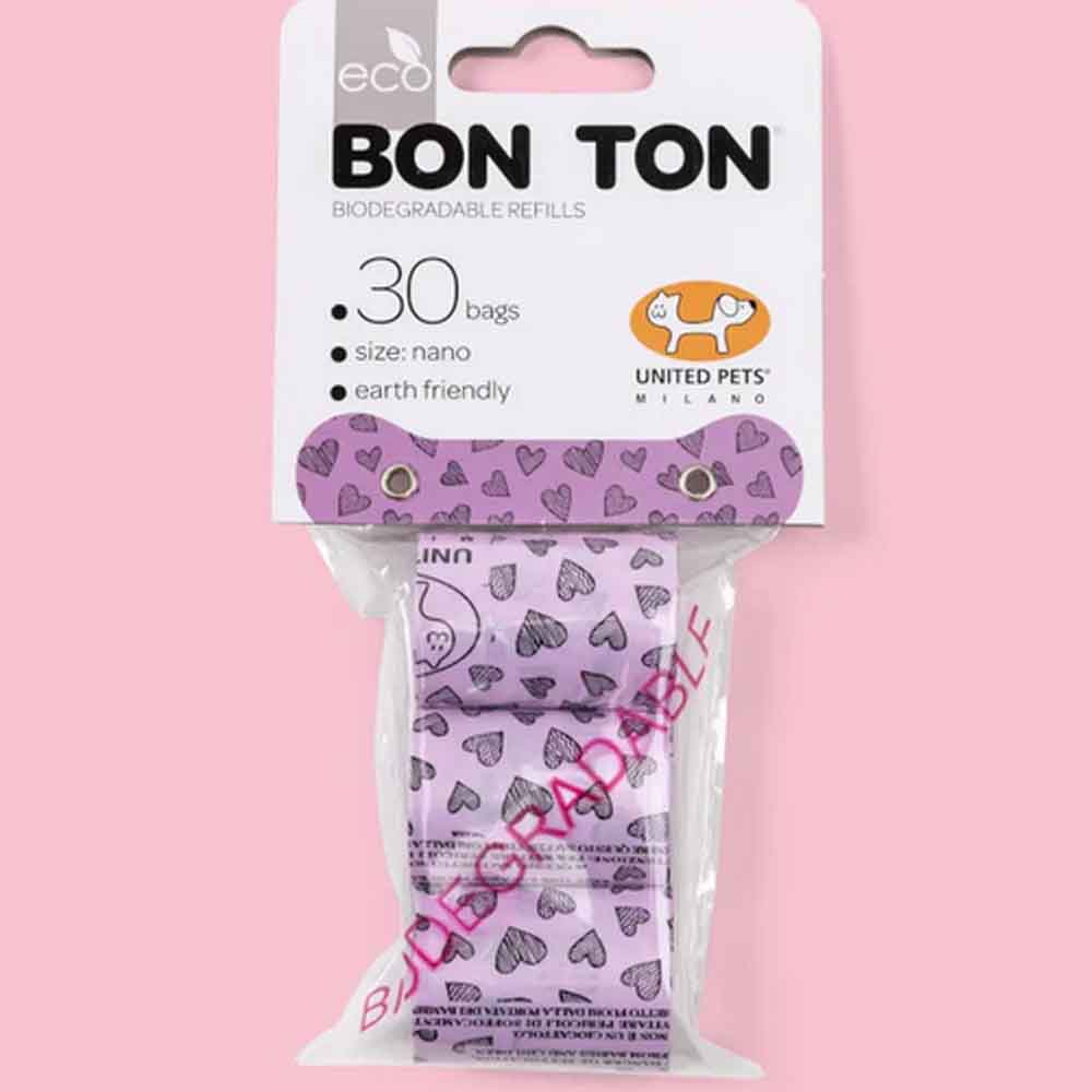 United Pets vrečke za pasje iztrebke so praktične in hkrati okolju prijazne: BON TON vrečke za pasje iztrebke so brez vonja ter izdelane iz biorazgradljivega materiala. Trajnostna surovina je biološko razgradljiva in ustreza vsem evropskim zakonskim smernicam za kompostiranje (EN13432). Vrečke so primerne za ponovno polnjenje vseh običajnih nosilcev vrečk za pasje iztrebke. Zaradi perforacije med vrečkami se lahko enostavno ločujejo in posamično odvzemajo.